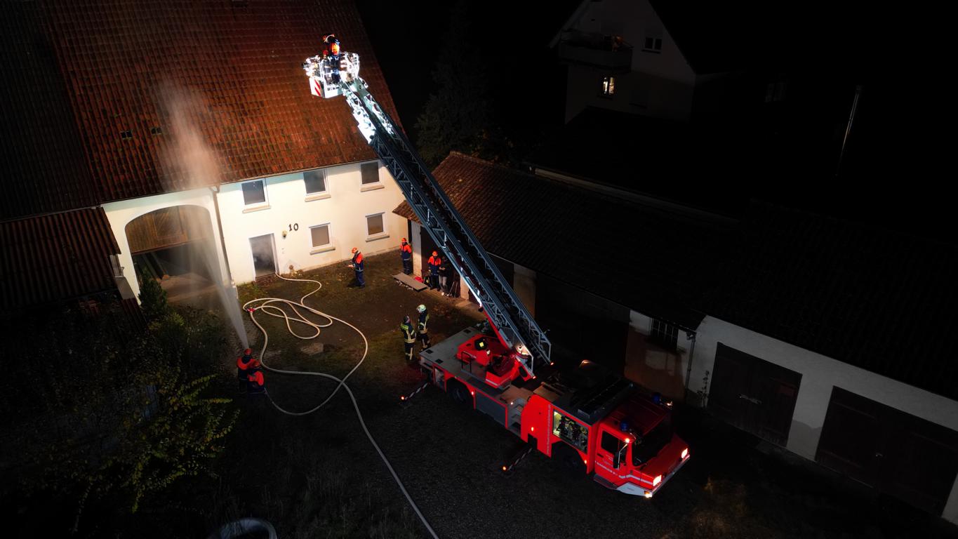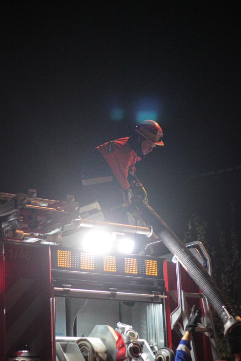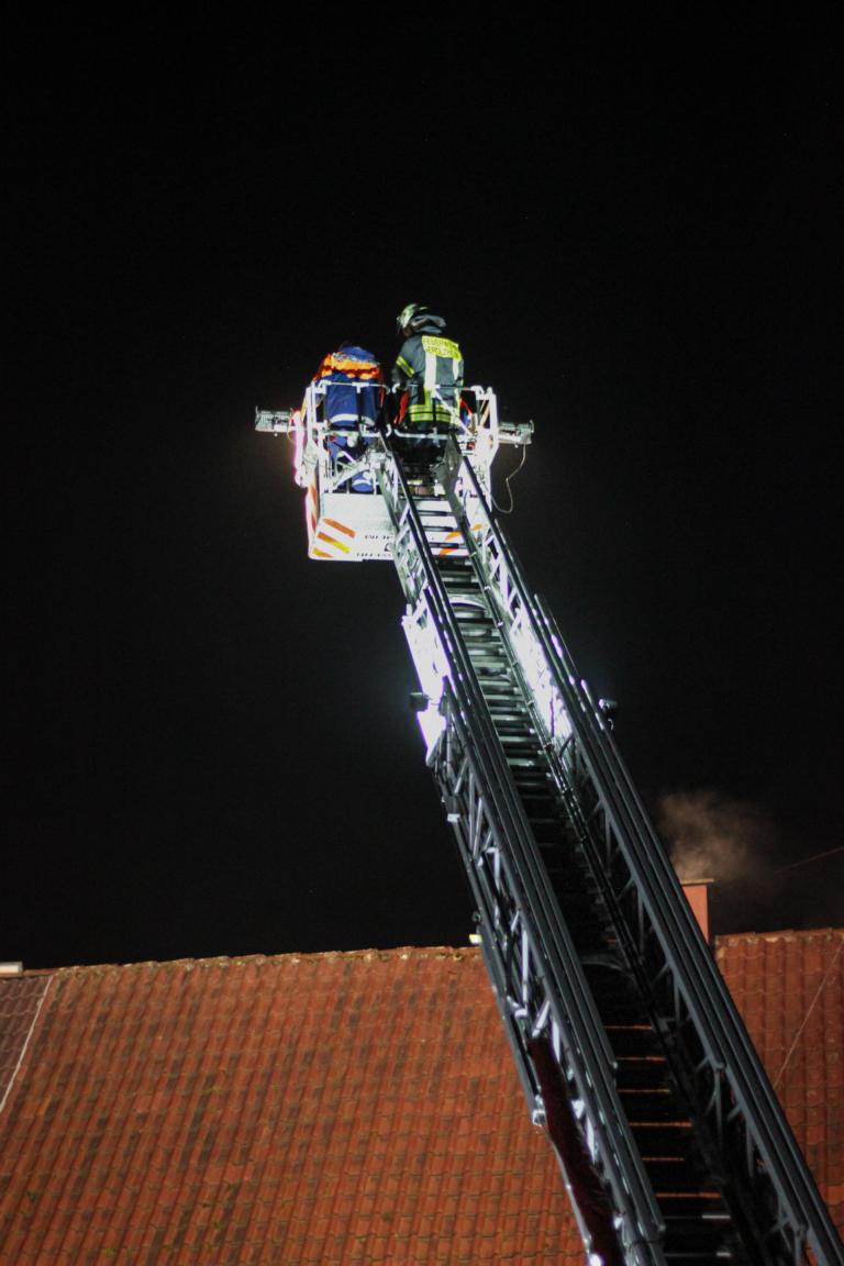 Anschließend gingen zwei Trupps zur Personensuche in das Gebäude, das zuvor mithilfe eines Nebelgeräts verraucht wurde. Ein weiterer Trupp stellte eine Riegelstellung zur benachbarten Scheune her. Außerdem wurde die Drehleiter eingesetzt, um das Übungsobjekt von oben zu kontrollieren, sie musste jedoch nicht zur Brandbekämpfung genutzt werden.