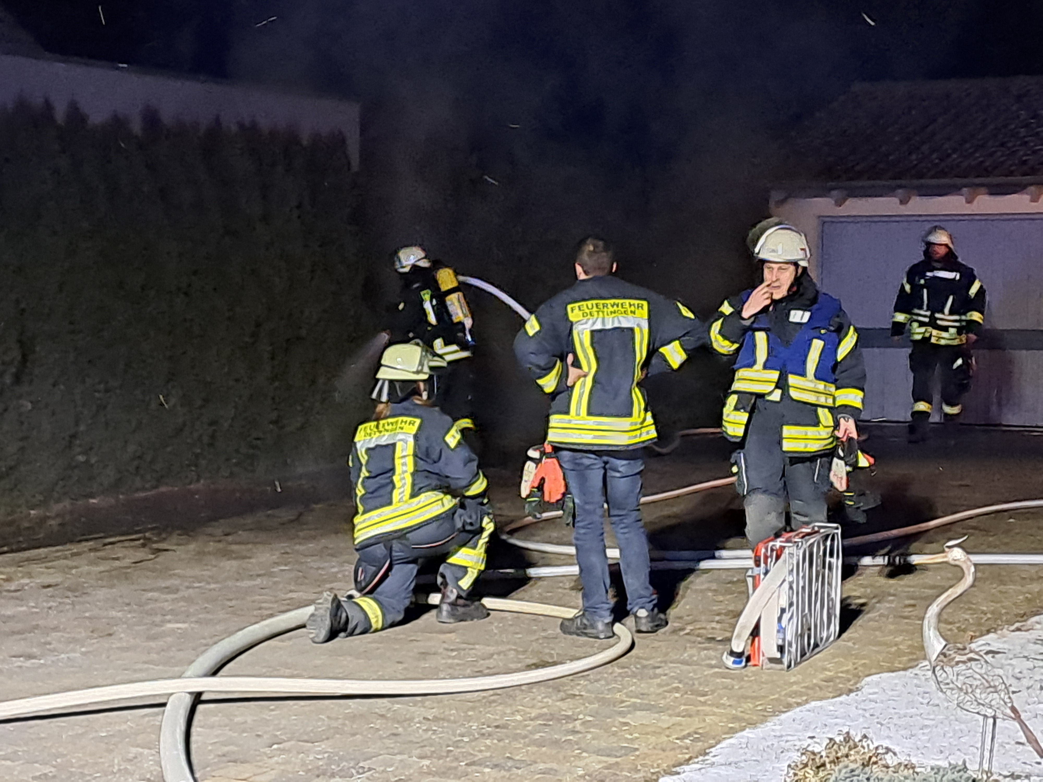 Ein brennende Hecke am Gebäude rief die Feuerwehren aus Dettingen und Erolzheim auf den Plan. Beim Eintreffen der ersten Kräfte brannte eine Thujahecke an einer Garage. Der Brand konnte durch die Feuerwehr Dettingen rasch gelöscht werden, sodass keine weiterer Schaden entstand.