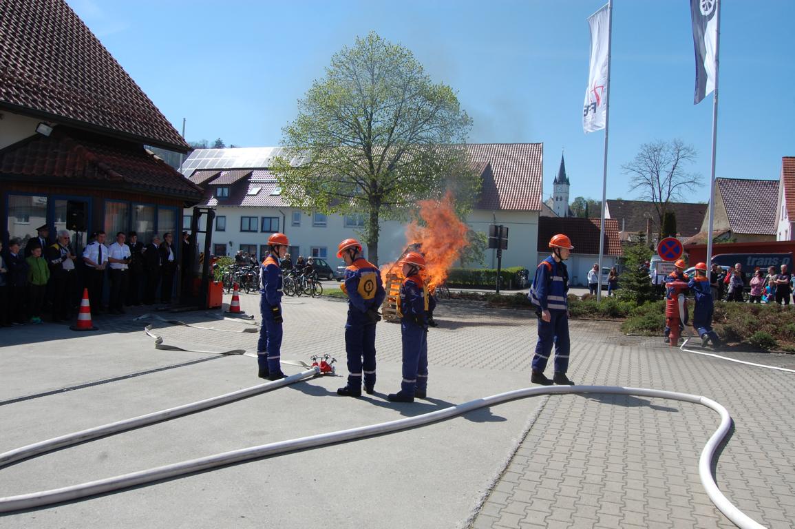 Das Rahmenprogramm umfasste zwei Schauübungen. Die Jugendfeuerwehr führte einen Löschangriff auf einen brennendes Haus aus. Danach zeigte die aktive Wehr, wie bei einem Verkehrsunfall die Befreiung der eingeklemmten Person in einem Pkw vorgegangen wird.