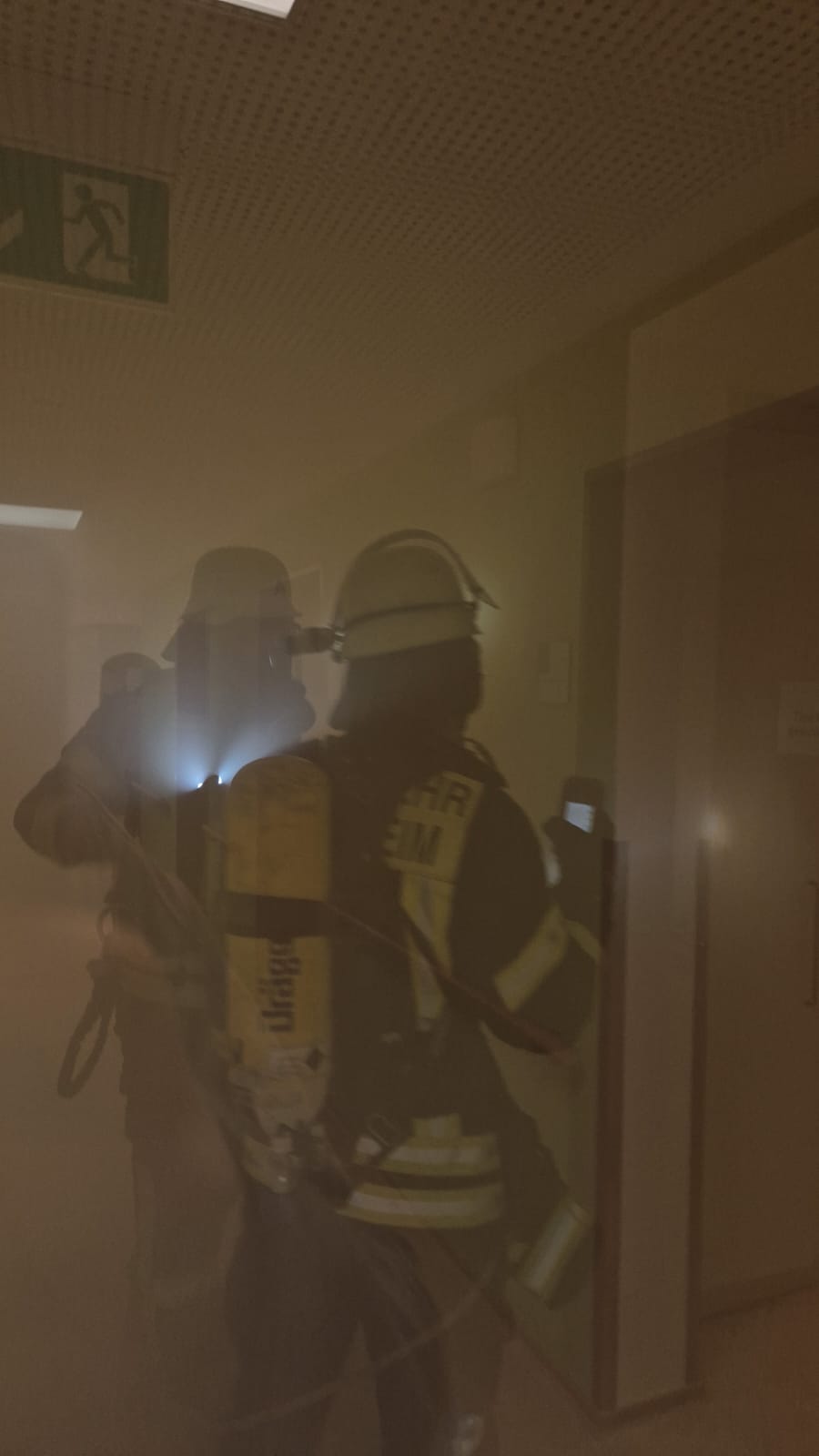 Mit einer ausgelöste Brandmeldeanlage startet die Übung. Nach Absprache mit der zuständigen Ansprechpartnerin des Seniorenzentrums und der Erkundung konnte ein Zimmerbrand vorgefunden werden. Hierbei wurden zwei Personen vermisst, sowie eine weitere Person im Aufzug eingeschlossen. Sofort gingen mehrere Trupps unter Atemschutz zur Personensuche und Brandbekämpfung in den verrauchten Bereich vor. Gleichzeitig lief die Evakuierung des Gebäudes sowie die Befreiung der Person im Aufzug. Nach kurzer Zeit konnten sowohl die Person aus dem Aufzug als auch die vermissten Personen gerettet werden. Auch der angenommene Brand konnte zügig unter Kontrolle gebracht werden.