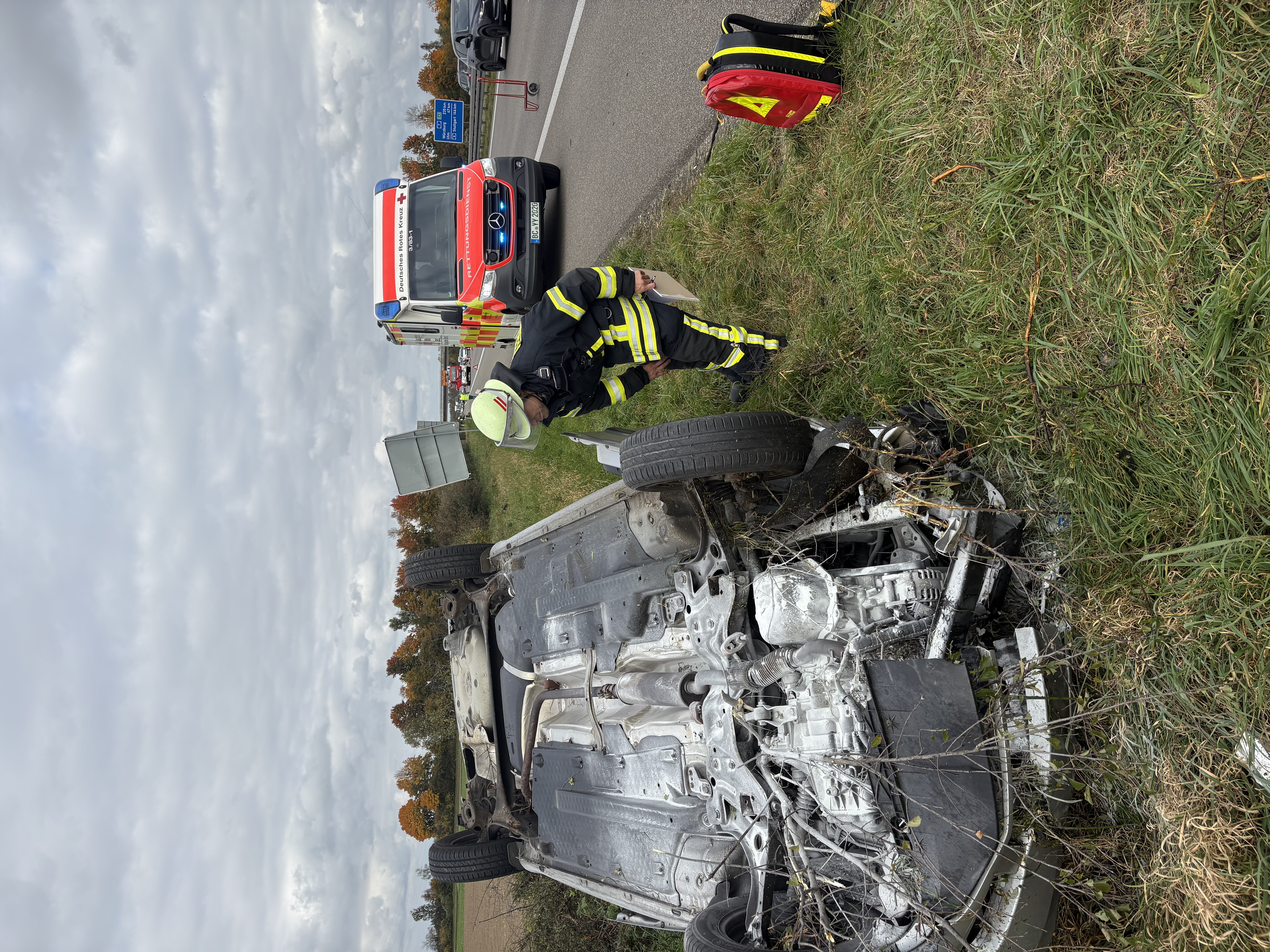 Am Freitag Nachmittag kam auf der BAB7 in Fahrtrichtung Süden ein Auto von der Straße ab. Kurz vor der Ausfahrt Berkheim prallte der PKW gegen einen Posten eines Verkehrsschildes und überschlug sich mehrfach, bis er auf dem Dach zu liegen kam.