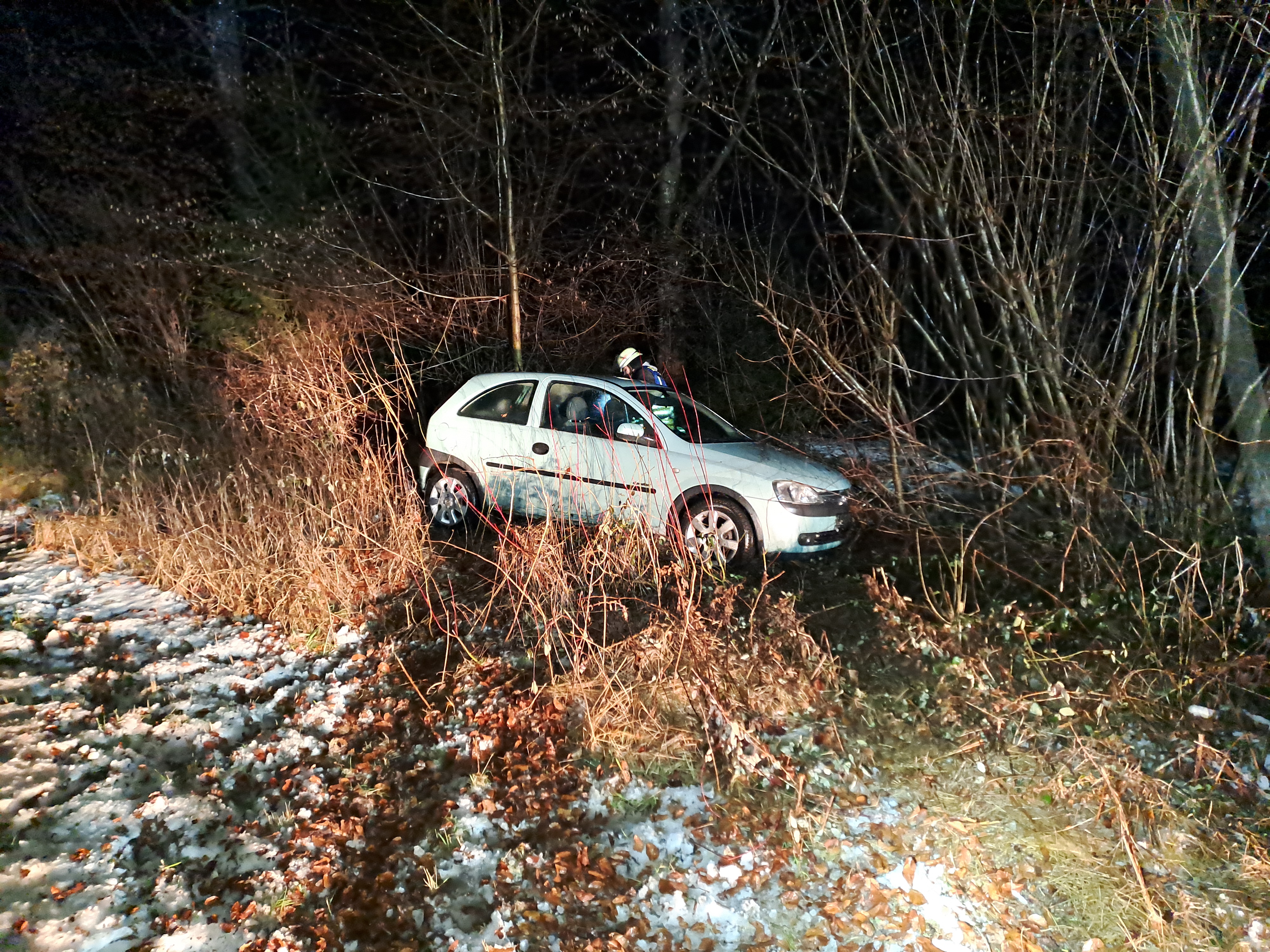 Ein weiterer Einsatz der Feuerwehr war aufgrund eines Verkehrsunfalls notwendig. Bei winterlichen Straßenverhältnissen kam ein Pkw von der Straße ab und kam abseits der Straße in einem Waldgebiet zum Stehen. Bei unserem Eintreffen war lediglich ein Zeuge anzutreffen. Der Fahrer hatte sich von der Unfallstelle entfernt.